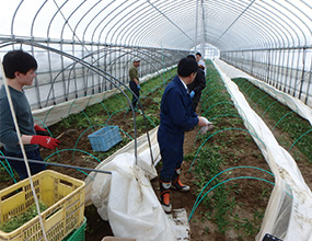 十勝が誇る農業の価値、農業を持続できる環境の大切さを知ってもらうため、北王農林では地元の親子を対象に、畑で野菜を収穫し、間伐材を使って調理する農業体験教室を実施しています。一方グループ会社の北王ホールディングスではビニールハウスの太陽熱を利用した冬季農作物栽培を研究中。冬季の農作業が増え、雇用増にもつながりました。事業を続けることで環境を守る、それが企業としてのミッション。人と農業をつなぐ努力は今後も続きます。