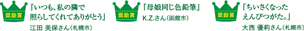 | ●審査委員 / | 大原 昌宏 氏(北海道大学総合博物館 教授) 菅井 貴子 氏(フリーキャスター・気象予報士) ビアンカ・フュルスト氏(環境カウンセラー・札幌環境保全アドバイザー) 寺澤 純(北海道新聞社 取締役 経営企画局長) |